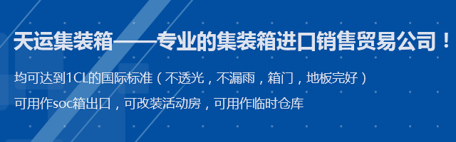 青島天運(yùn)集裝箱服務(wù)有限公司,是專業(yè)的集裝箱進(jìn)口銷售貿(mào)易公司,公司與各大船公司租箱公司保持著密切的合作關(guān)系,箱源充足,所有出售集裝箱均可達(dá)到IICL的國(guó)際標(biāo)準(zhǔn)(不透光,不漏雨,箱門,地板完好)可用作soc箱出口,可改裝活動(dòng)房,可用作臨時(shí)倉庫。